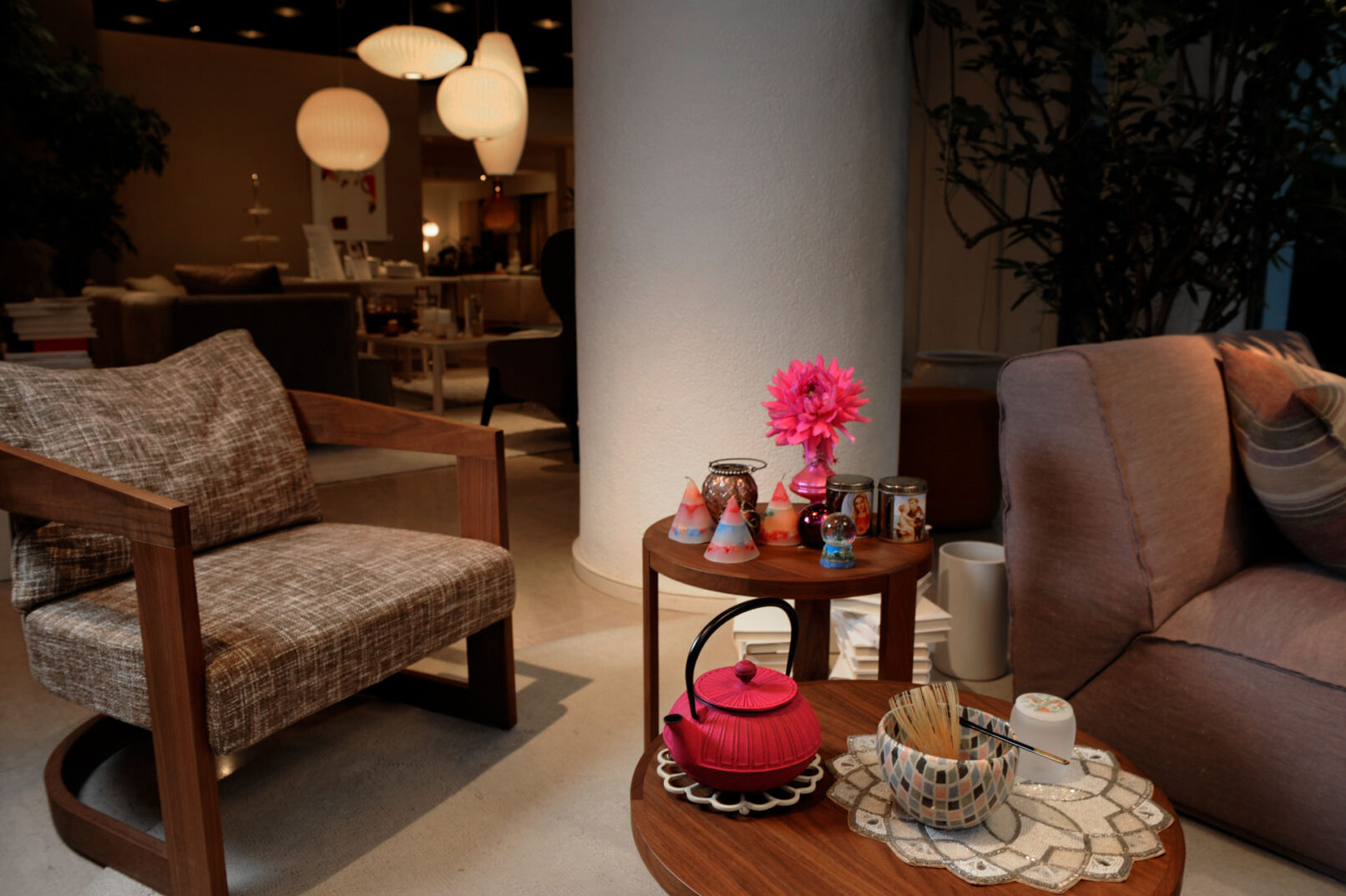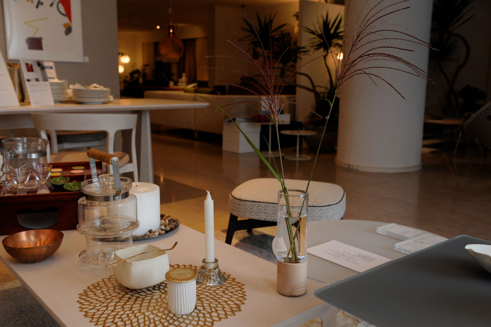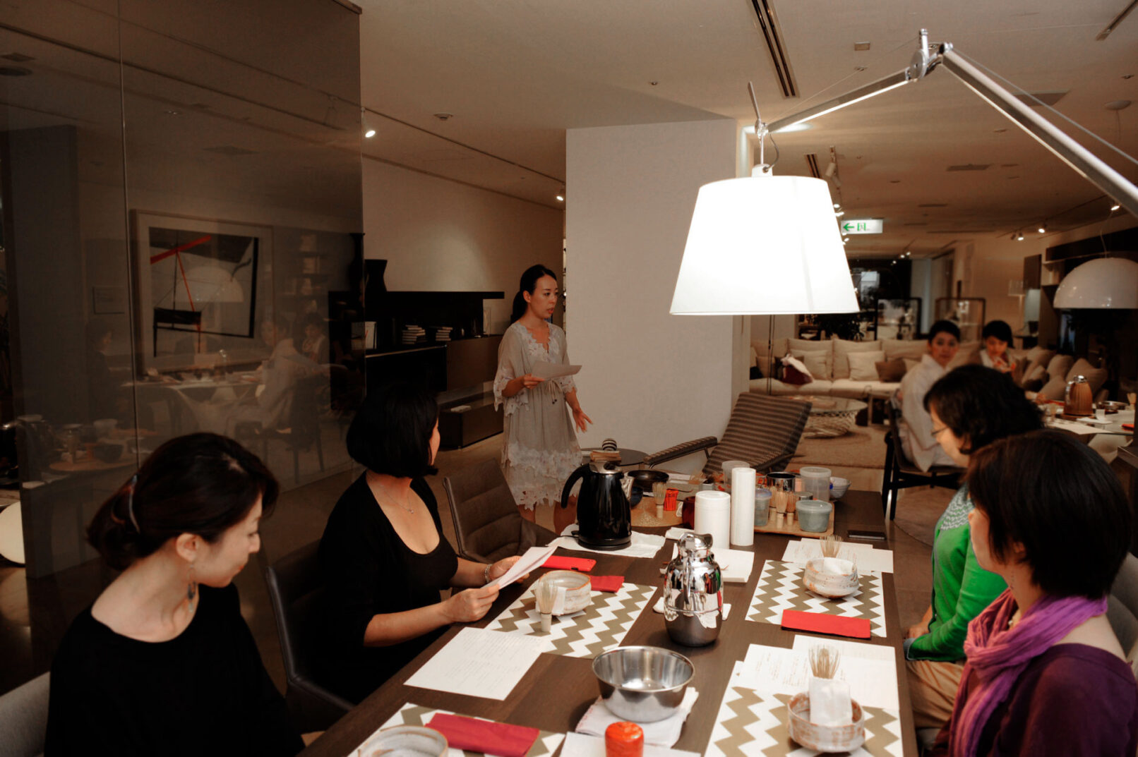 Participants were invited to experience a flower arrangement by Mari Yamaoka, a florist, and Fuyuko Kobori, who taught them how to prepare and enjoy tea. Beautiful furniture from Arflex Tokyo, the interior shop of the venue, was used to set up different types of tea tables for different occasions, offering a simple way to enjoy the tea ceremony.
