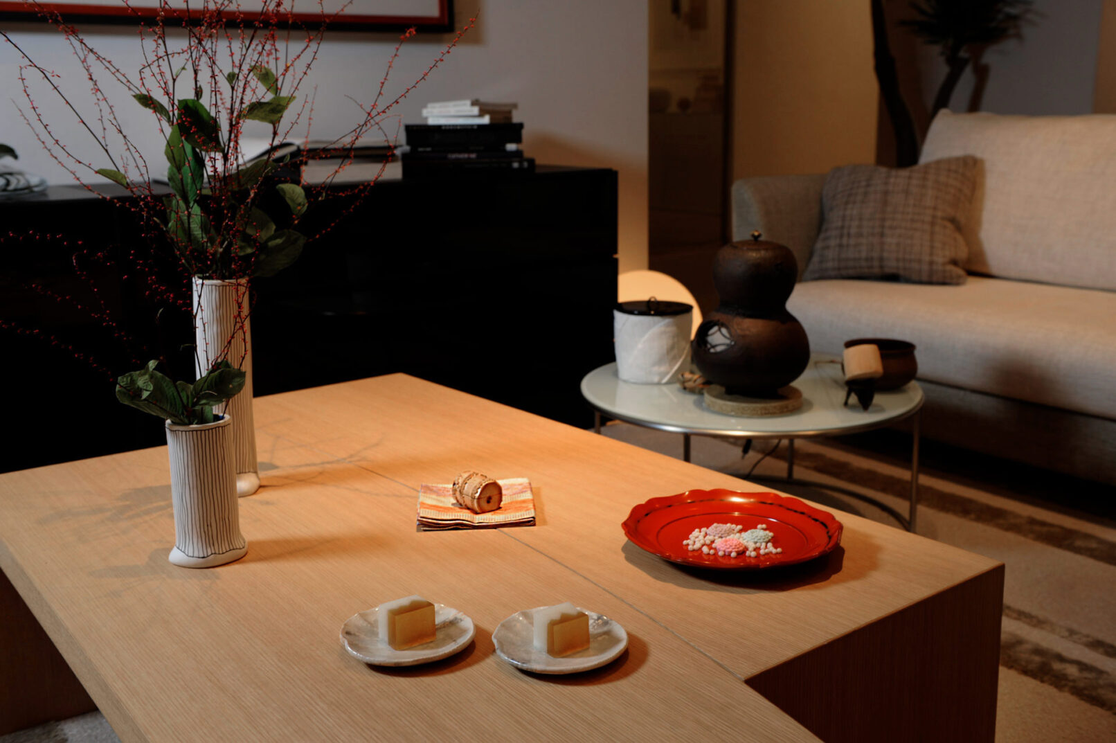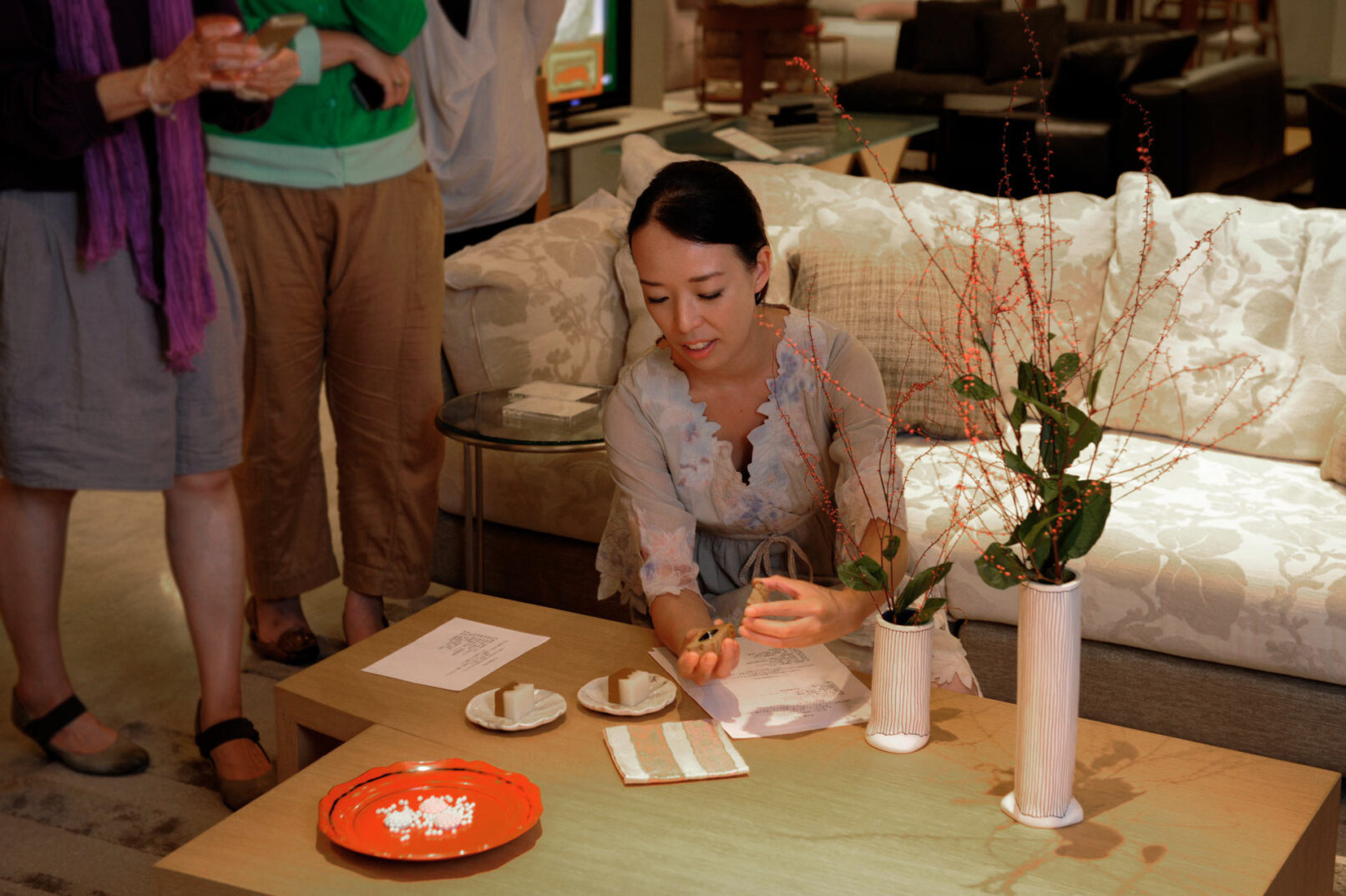 リビングスタイルで楽しむ、茶の湯を取り入れたおもてなし おもてなしの原点であり、500年の歴史を持つ茶の湯。茶室に花を活けてのお点前やおいしいお菓子でのおもてなしを、現代のリビングスタイルで簡単に楽しめるワークショップを開催しました。参加者の皆さまにはフローリストとして活躍する山岡まり氏によるおもてなしのフラワーアレンジメントと、小堀芙由子による簡単なお茶の点て方や楽しみ方を体験していただきました。会場のインテリアショップ、アルフレックス東京の美しい家具を用いてシチュエーションやオケージョン別の茶席を設え、茶の湯の気軽な楽しみ方を提案しました。